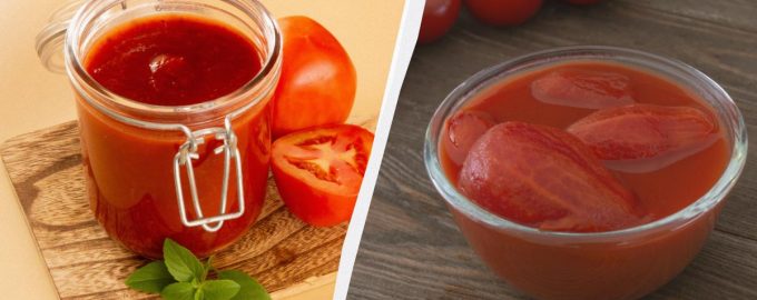 Tomaten im eigenen Saft ohne Schale sind zarter und einfacher zu verwenden, aber der Schritt mit dem Schälen kann übersprungen werden.