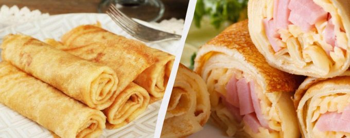 Diese Pfannkuchen sind so köstlich, dass dieses Rezept sicher zu Ihrem Lieblingsessen wird. Pfannkuchen mit Schinken und Käse / Collage My, Foto depositphotos.
